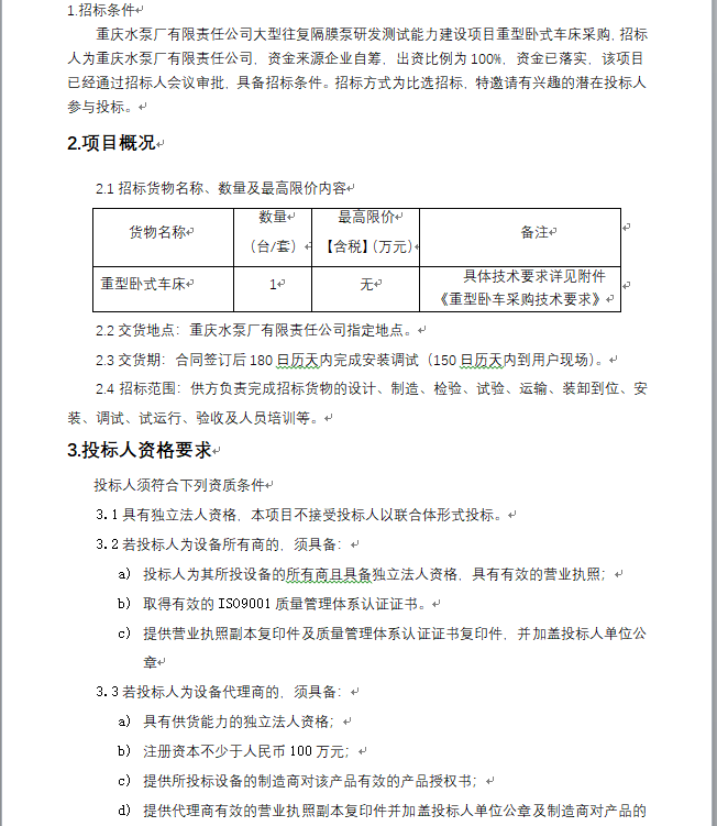 大型往復(fù)隔膜泵研發(fā)測試能力建設(shè)項目 重型臥式車床采購 招標(biāo)公告