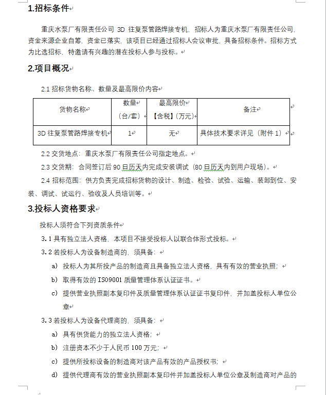 3D往復(fù)泵管路焊接專機(jī) 招標(biāo)公告