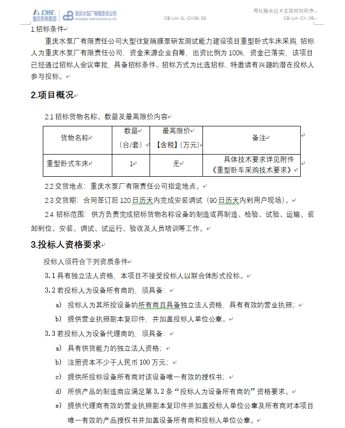 大型往復(fù)隔膜泵研發(fā)測試能力建設(shè)項目 重型臥式車床采購 招標(biāo)公告(第二次)