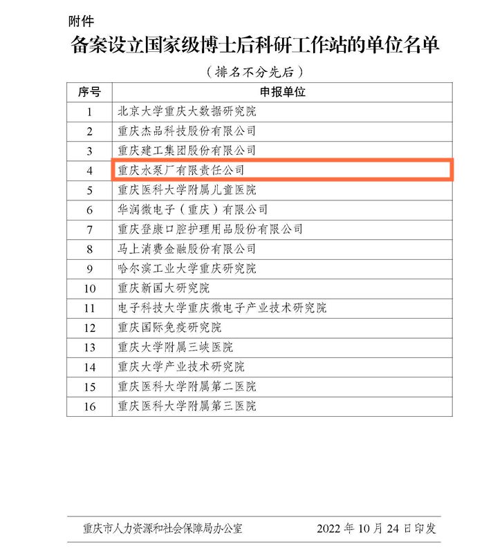 10月24日,重慶市人力資源和社會保障局辦公室印發(fā)《關(guān)于在北京大學(xué)重慶大數(shù)據(jù)研究院等16 個單位設(shè)立國家級博士后科研工作站的通知》(渝人社辦〔2022〕304號),根據(jù)全國博士后管委會辦公室《關(guān)于2022 年第一批次博士后科研工作站新設(shè)站備案情況的函》(博管辦〔2022〕108 號),重泵公司獲批設(shè)立國家級博士后科研工作站。