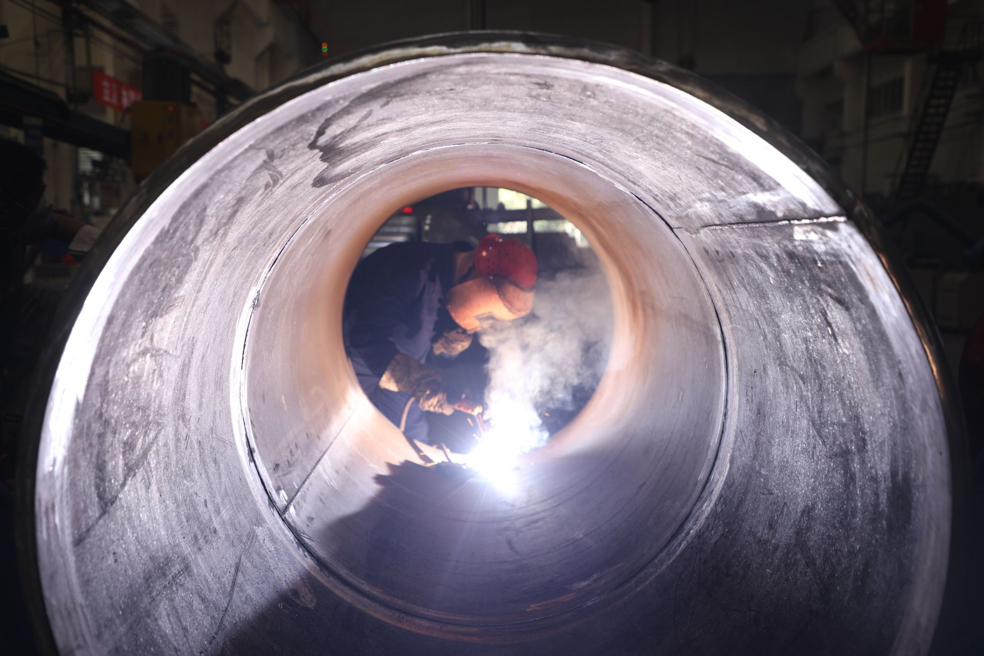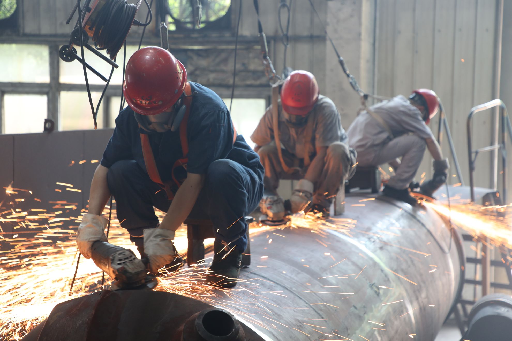 容器車間內焊接區域的師傅們身著厚重的裝備細致地打磨著工件,盡管熱浪不斷地涌向車間,汗水浸濕了黃順兵的衣衫,工作服濕了又干,干了又濕,但師傅們依舊聚精會神地站在生產線上,目光里滿是認真專注。