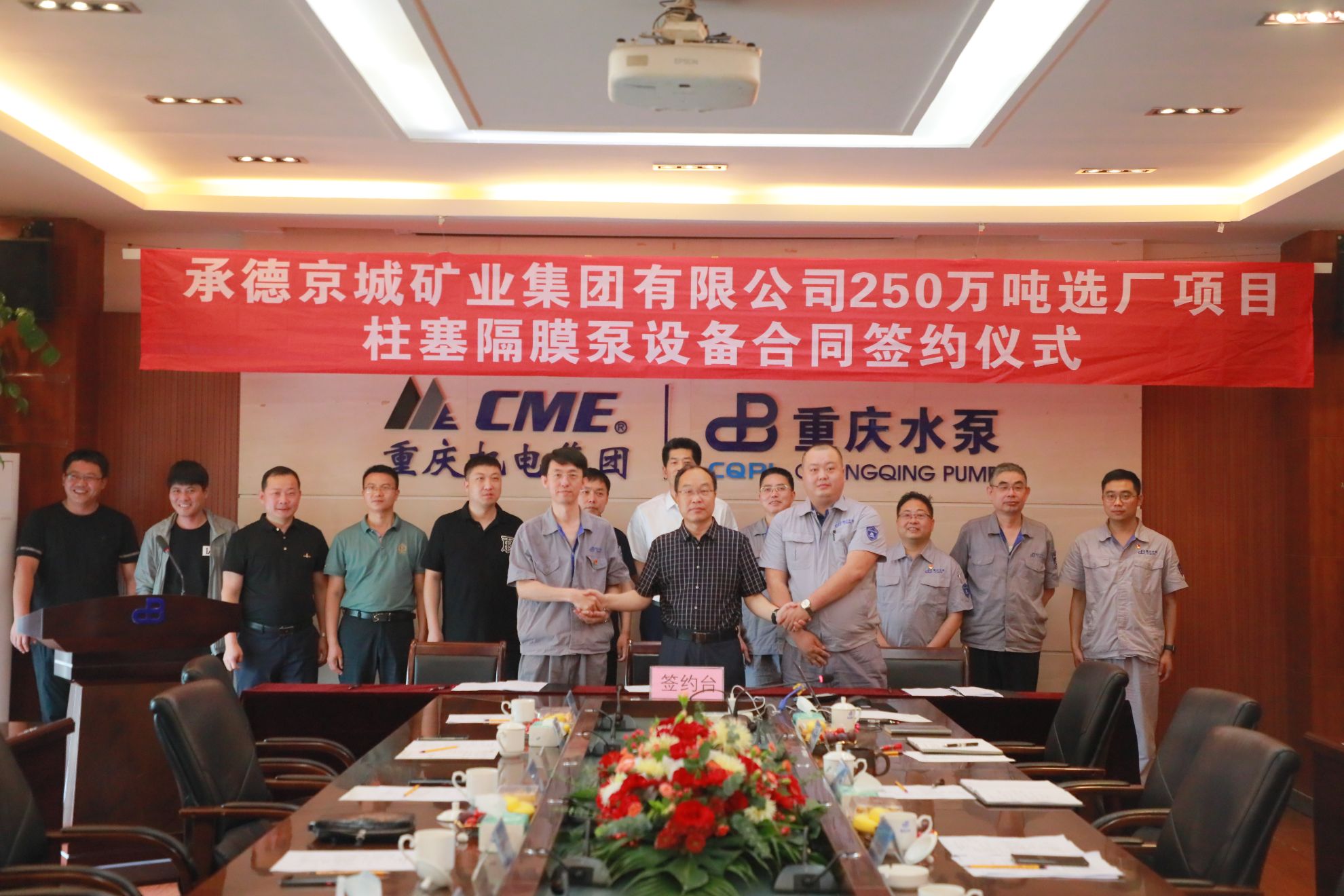 6月14日,重泵公司與承德京城礦業集團舉行柱塞隔膜泵合同訂單簽約儀式。承德京城礦業集團有限公司副總經理李群力、李柱國、楊志新、采購部副部長張森,機電股份公司黨委書記、董事長張福倫,重泵公司黨委書記、董事長李方忠、黨委副書記、總經理彭忠、副總經理潘志敏、何智奎參加活動。